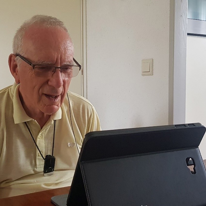 Voordat we elkaar weer gedag zeggen heeft Meneer de Koning nog een laatste tip voor de medewerkers die straks gaan beeldbellen met hem: ‘Ik ben slecht horend, maar het geluid op deze tablet is erg goed, medewerkers hoeven zeker niet te schreeuwen, al is het wel fijn als ze niet te snel praten en goed voor de camera gaan zitten zodat ik kan liplezen.‘