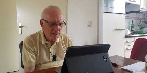 Meneer de Koning (cliënt van team Colmschate Noord & Vijfhoek) heeft niet veel tijd nodig de oproep te beantwoorden. Al na een paar seconden verschijnt zijn lachende gezicht in beeld. Nog even de tablet zo neerzetten dat ook zijn vrouw af en toe in beeld komt, en het interview kan beginnen!