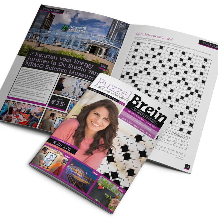 PuzzelBrein is een puzzelblad met ruim 36 puzzels zoals Kruiswoordpuzzels, Sudoku’s, Woordzoekers, Cryptogrammen etc. En bij elke puzzel is een prijs te winnen. De waarde van de totale prijzenpot is ruim €20.000,-!
