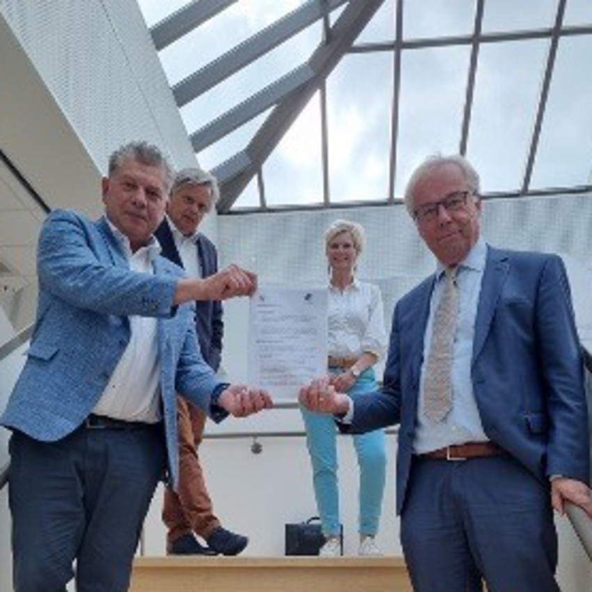 *Op de foto links dhr. Henk van Zwam voorzitter raad van bestuur Carinova, rechts van hem - Wouter van der Kam, voorzitter raad van bestuur Saxenburgh, bovenaan de trap Rita Hunse, manager Ouderenzorg Saxenburgh, naast haar dhr. Martin Plant, directeur Thuiszorg Carinova.